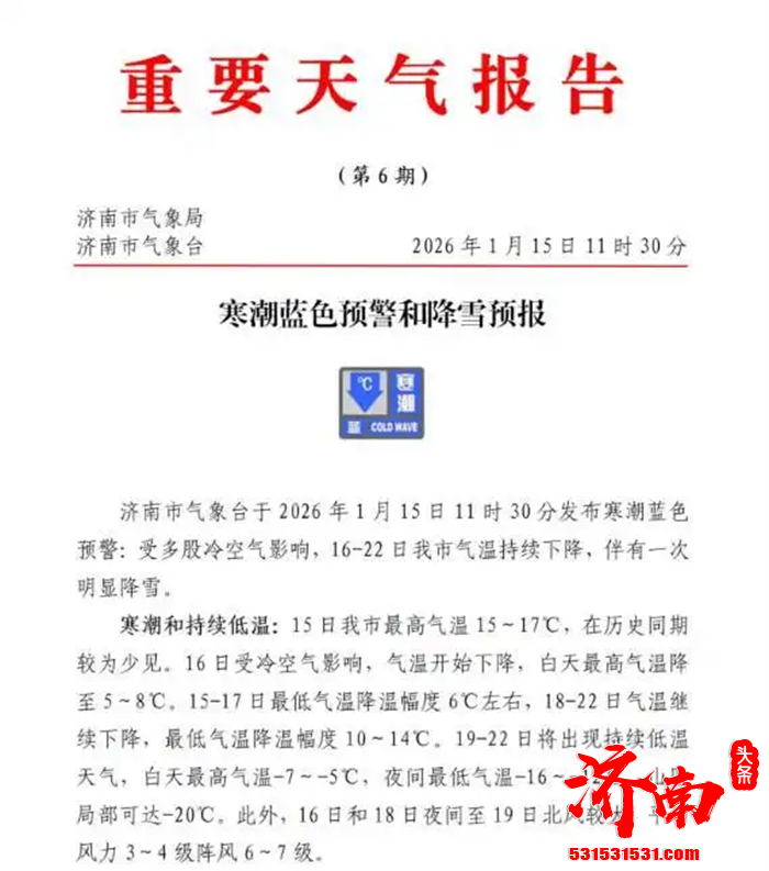 16-22日济南市气温持续下降,伴有一次明显降雪